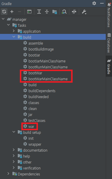 bootWar, bootWarMainClassName, war 가 추가된걸 확인 할 수 있다.